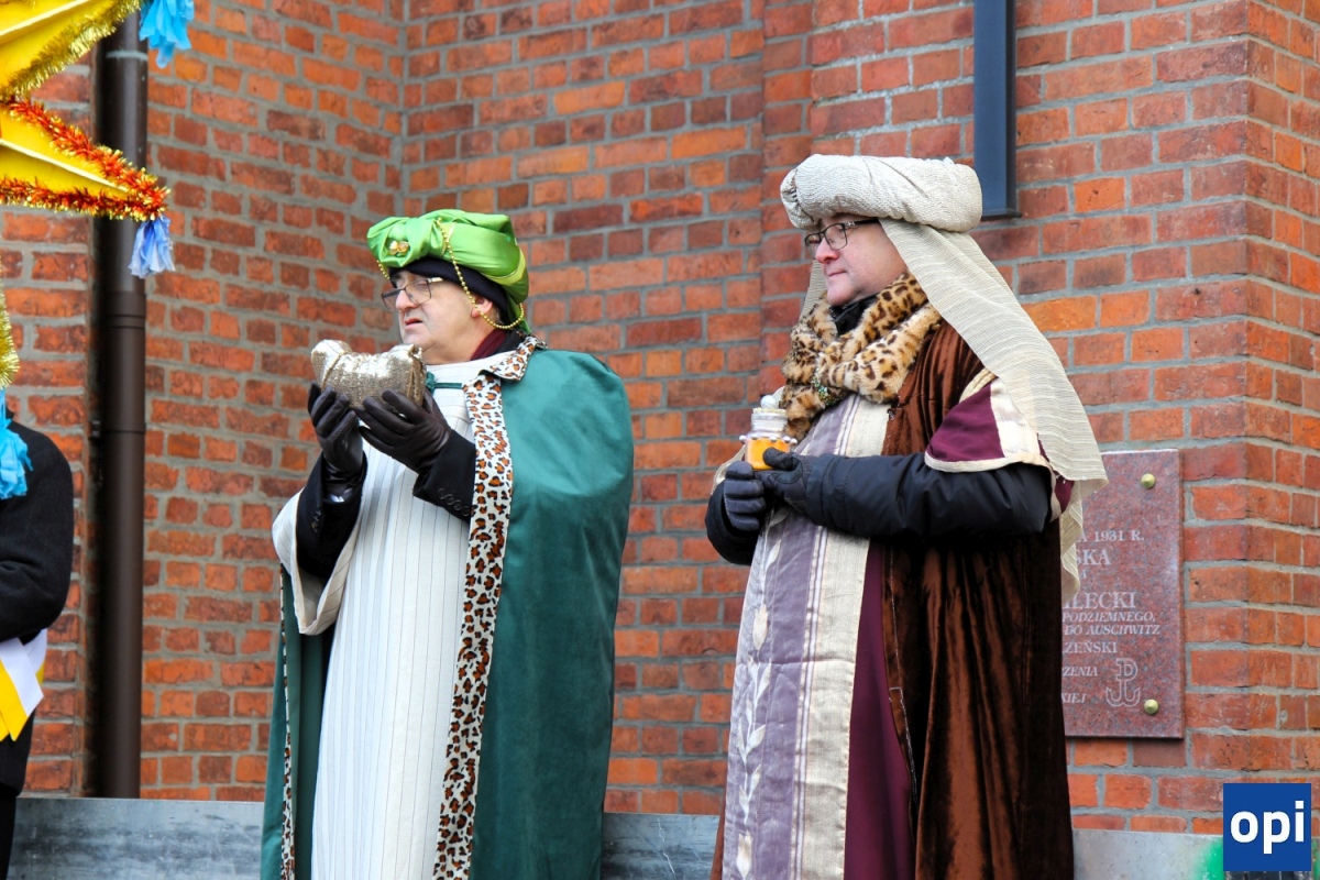Baltazar, Kacper i Melchior prowadzeni przez gwiazdę betlejemską, a za nimi tłum mieszkańców Ostrowi Mazowieckiej, na trasie kościół pw. WNMP - kościół pw. Chrystusa Dobrego Pasterza.