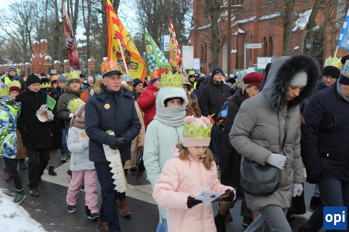 Baltazar, Kacper i Melchior prowadzeni przez gwiazdę betlejemską, a za nimi tłum mieszkańców Ostrowi Mazowieckiej, na trasie kościół pw. WNMP - kościół pw. Chrystusa Dobrego Pasterza.
