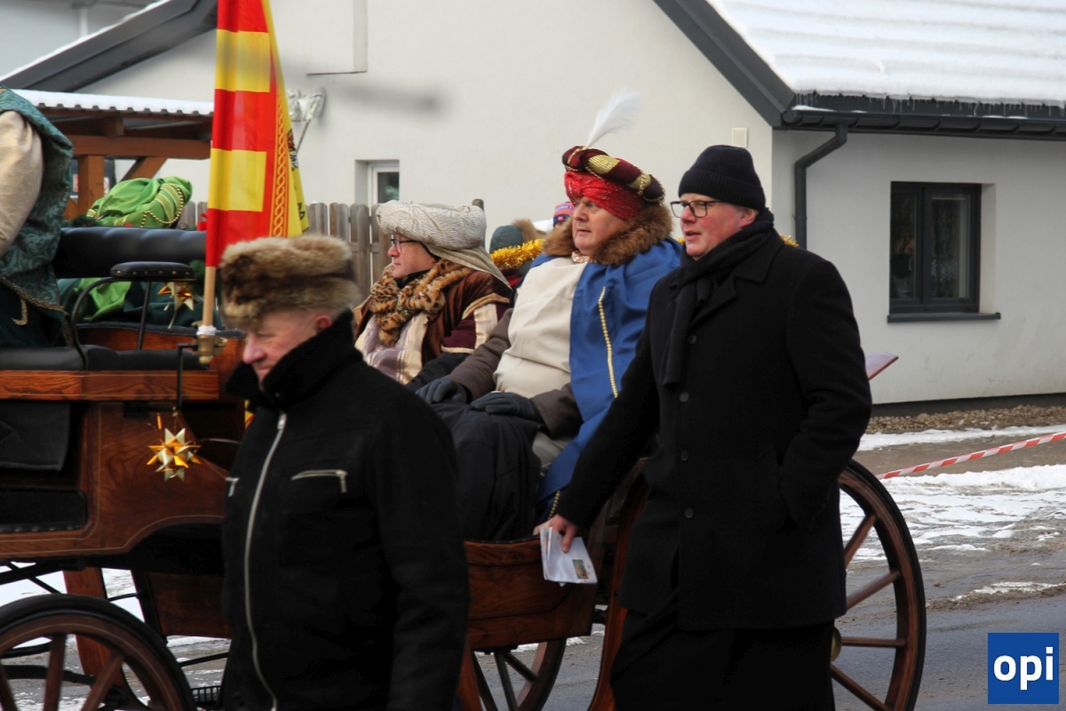 Baltazar, Kacper i Melchior prowadzeni przez gwiazdę betlejemską, a za nimi tłum mieszkańców Ostrowi Mazowieckiej, na trasie kościół pw. WNMP - kościół pw. Chrystusa Dobrego Pasterza.