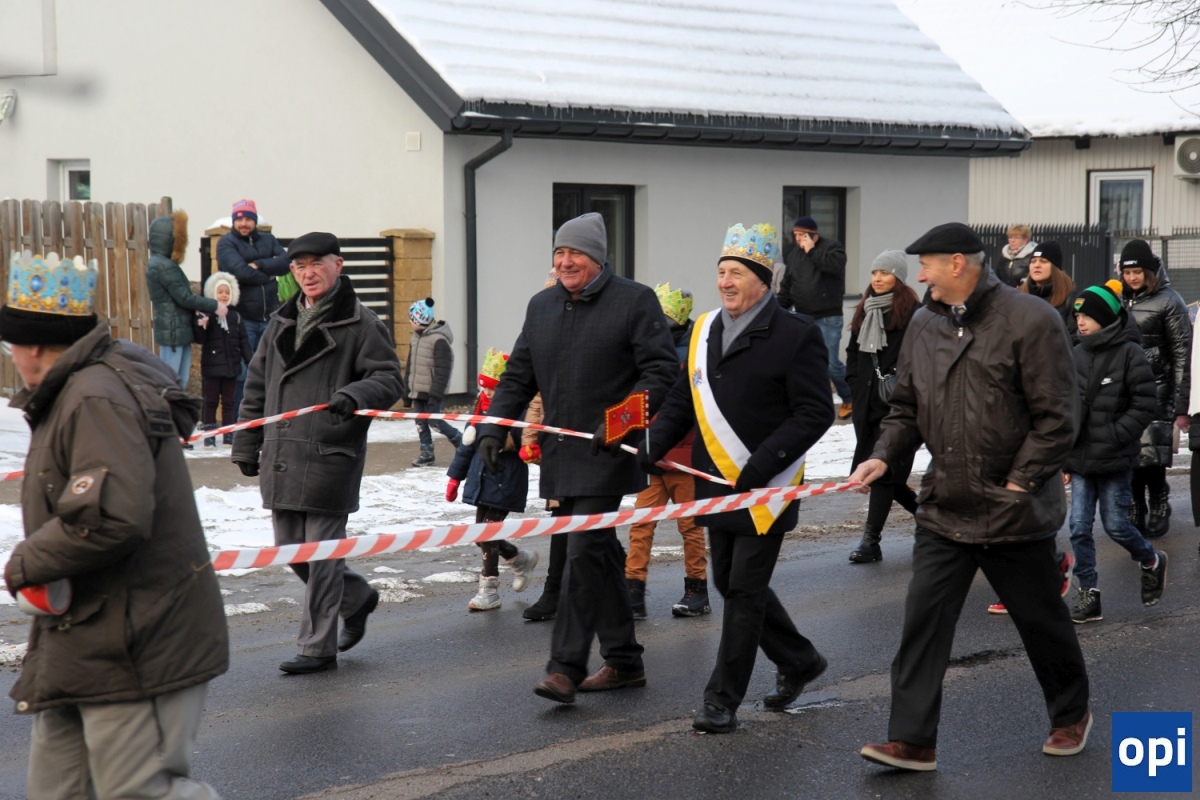 Baltazar, Kacper i Melchior prowadzeni przez gwiazdę betlejemską, a za nimi tłum mieszkańców Ostrowi Mazowieckiej, na trasie kościół pw. WNMP - kościół pw. Chrystusa Dobrego Pasterza.