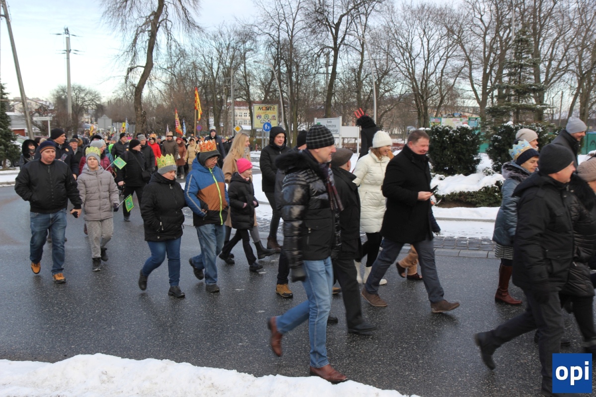 Baltazar, Kacper i Melchior prowadzeni przez gwiazdę betlejemską, a za nimi tłum mieszkańców Ostrowi Mazowieckiej, na trasie kościół pw. WNMP - kościół pw. Chrystusa Dobrego Pasterza.
