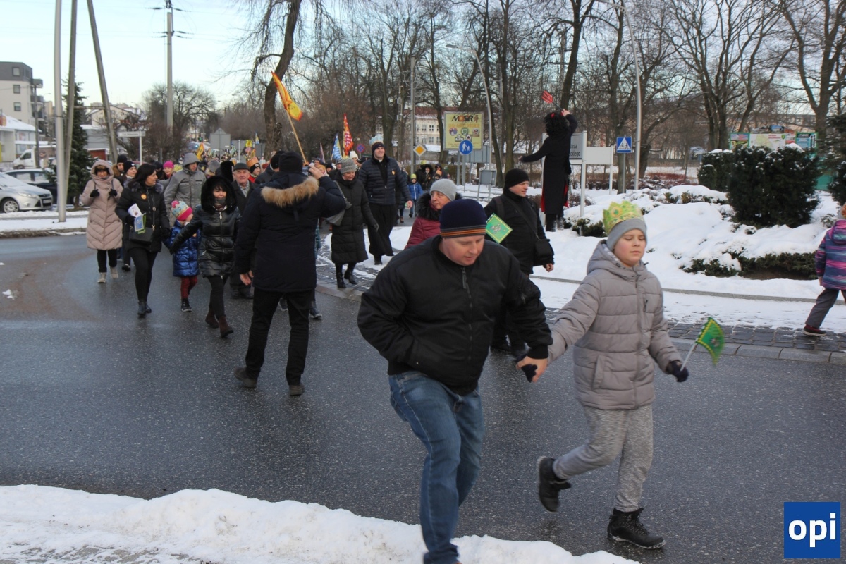 Baltazar, Kacper i Melchior prowadzeni przez gwiazdę betlejemską, a za nimi tłum mieszkańców Ostrowi Mazowieckiej, na trasie kościół pw. WNMP - kościół pw. Chrystusa Dobrego Pasterza.