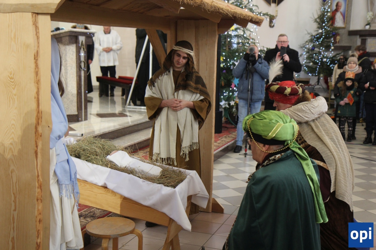 Baltazar, Kacper i Melchior prowadzeni przez gwiazdę betlejemską, a za nimi tłum mieszkańców Ostrowi Mazowieckiej, na trasie kościół pw. WNMP - kościół pw. Chrystusa Dobrego Pasterza.