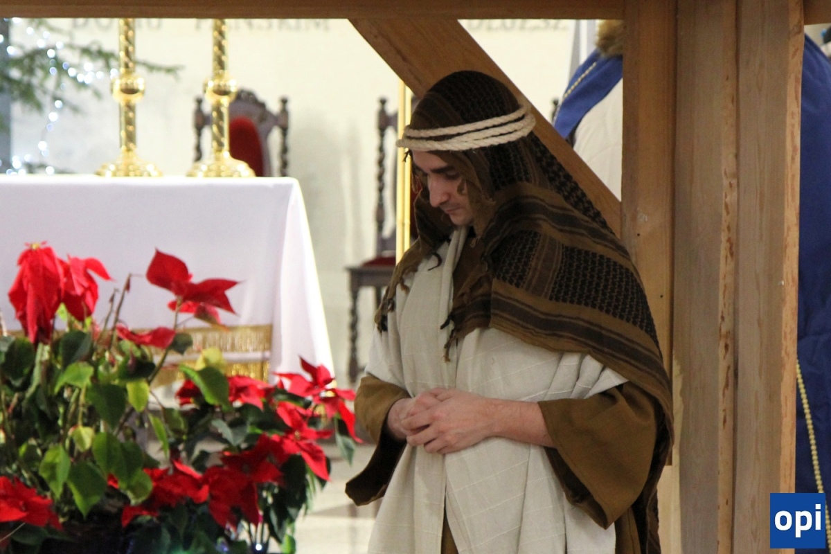 Baltazar, Kacper i Melchior prowadzeni przez gwiazdę betlejemską, a za nimi tłum mieszkańców Ostrowi Mazowieckiej, na trasie kościół pw. WNMP - kościół pw. Chrystusa Dobrego Pasterza.
