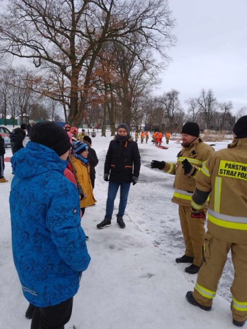Pokazowe ćwiczenia strażaków PSP na stawie miejskim dla uczniów Jedynki