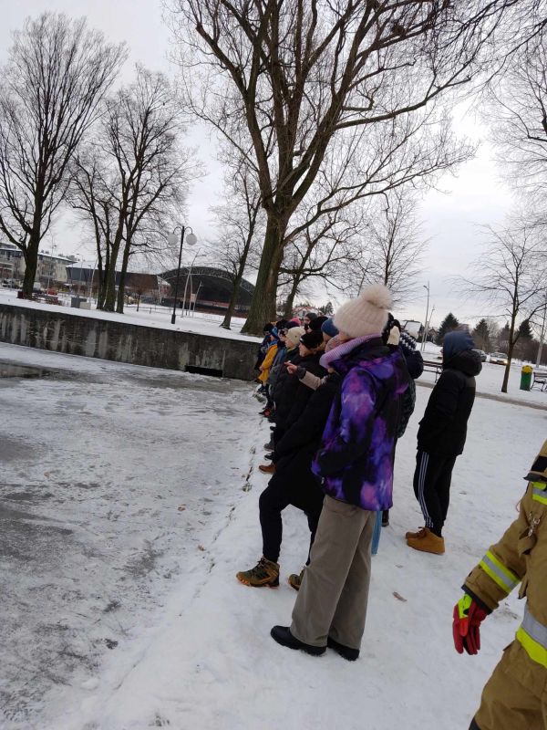 Pokazowe ćwiczenia strażaków PSP na stawie miejskim dla uczniów Jedynki