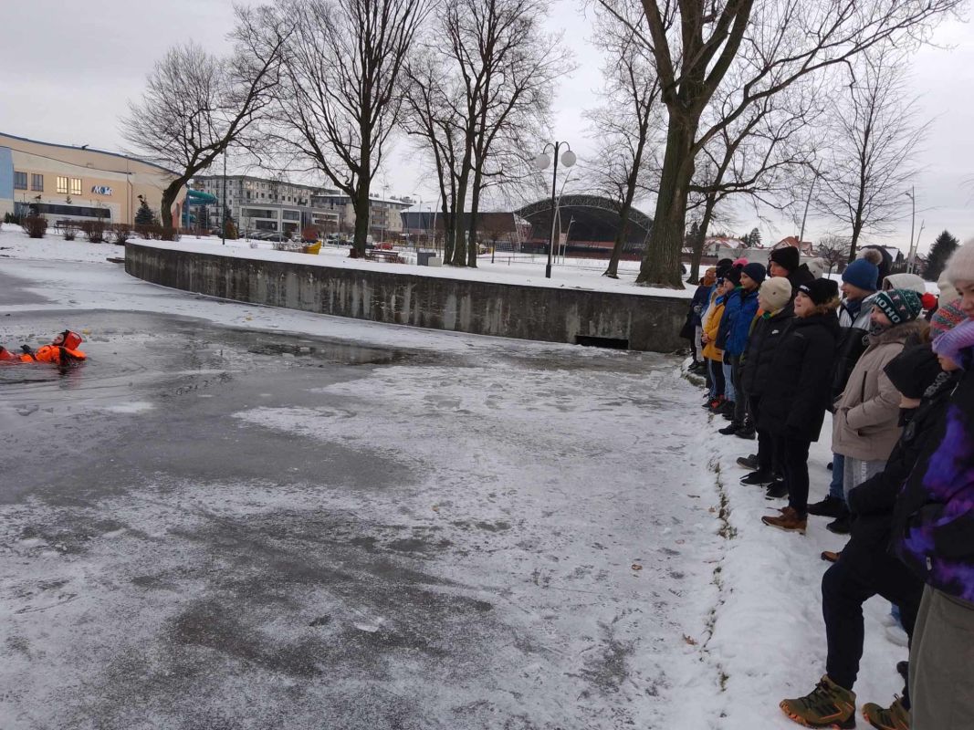 Pokazowe ćwiczenia strażaków PSP na stawie miejskim dla uczniów Jedynki