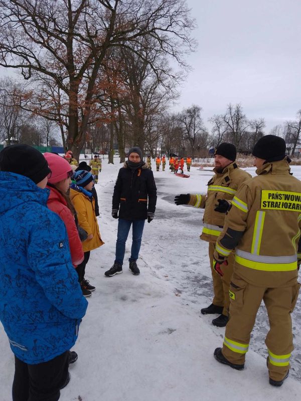 Pokazowe ćwiczenia strażaków PSP na stawie miejskim dla uczniów Jedynki