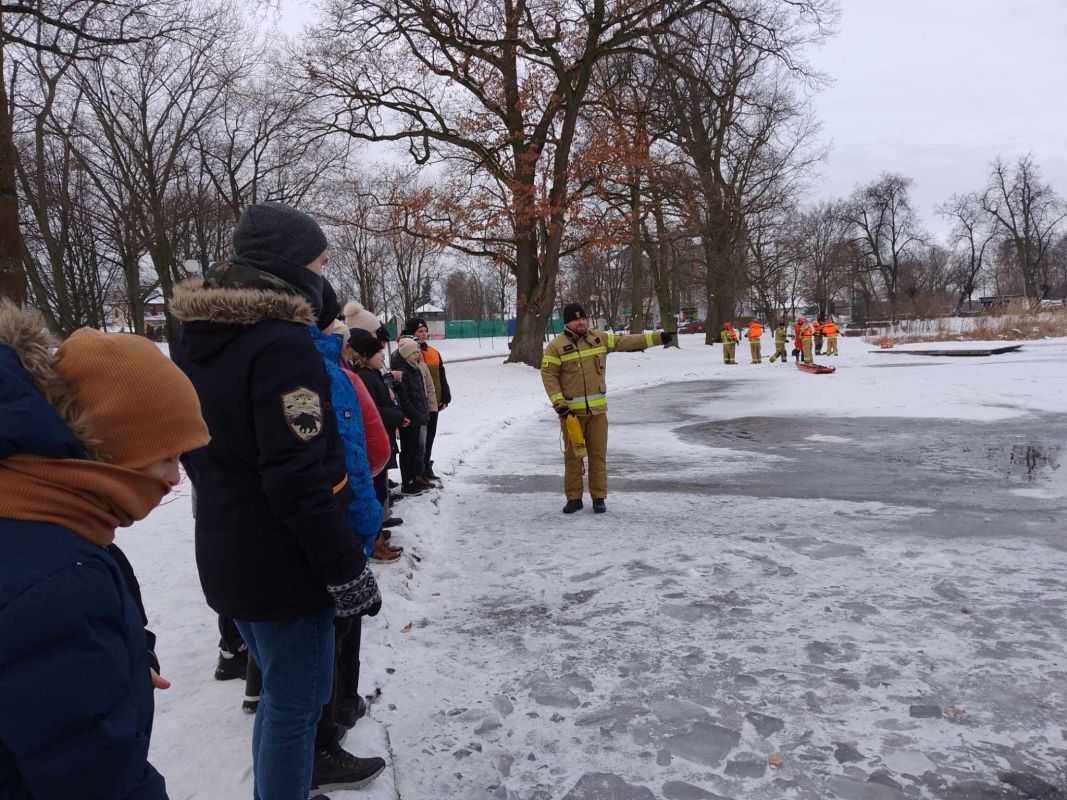 Pokazowe ćwiczenia strażaków PSP na stawie miejskim dla uczniów Jedynki