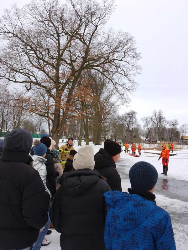 Pokazowe ćwiczenia strażaków PSP na stawie miejskim dla uczniów Jedynki