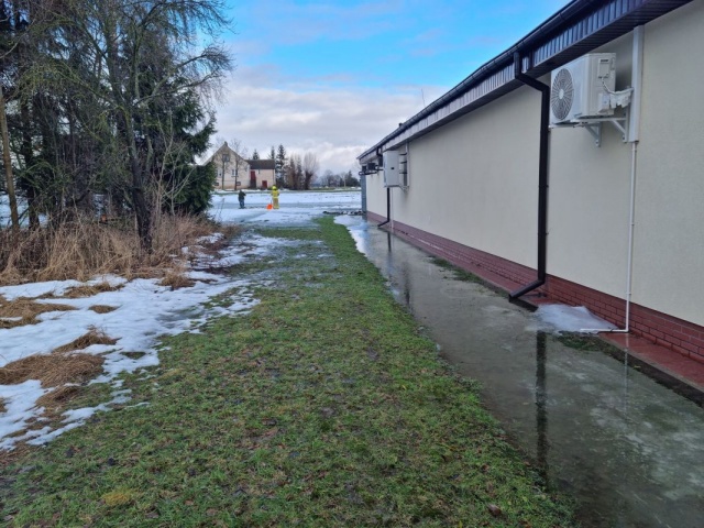 Działania strażaków polegające na odprowadzeniu gromadzącej się wody wokół budynku.