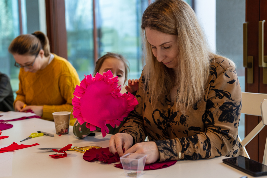 Rodzinne warsztaty z cyklu "Kreatywne historie". Uczestnicy wykonywali walentynkowe ozdoby z filcu.