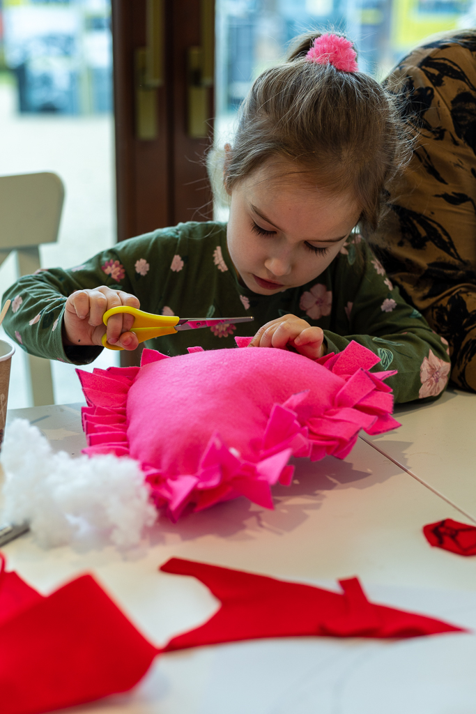 Rodzinne warsztaty z cyklu "Kreatywne historie". Uczestnicy wykonywali walentynkowe ozdoby z filcu.