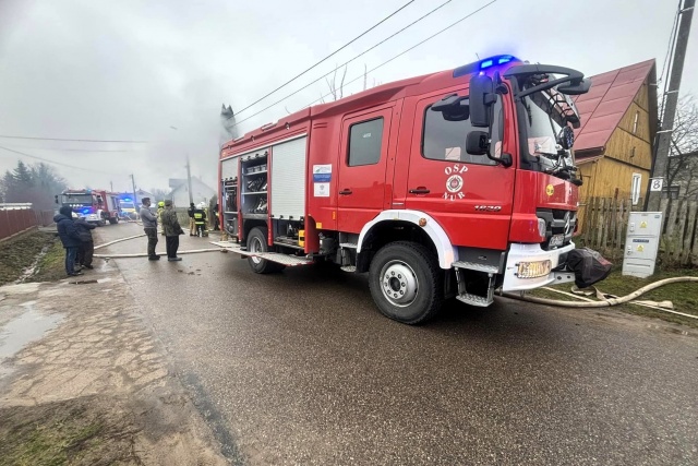 Do gaszenia pożaru drewnianego budynku zadysponowano 7 zastępów strażaków.