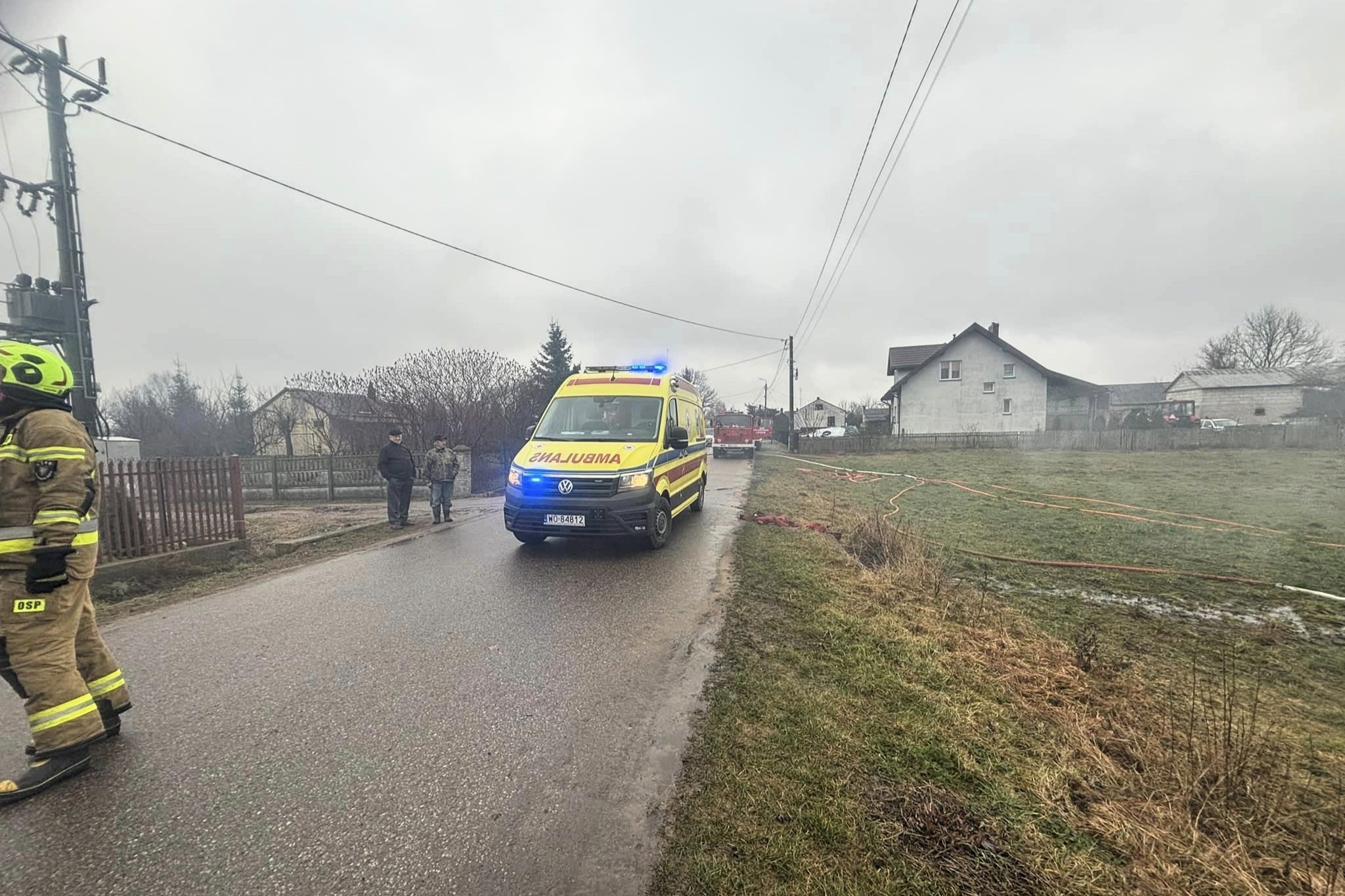 Do gaszenia pożaru drewnianego budynku zadysponowano 7 zastępów strażaków.