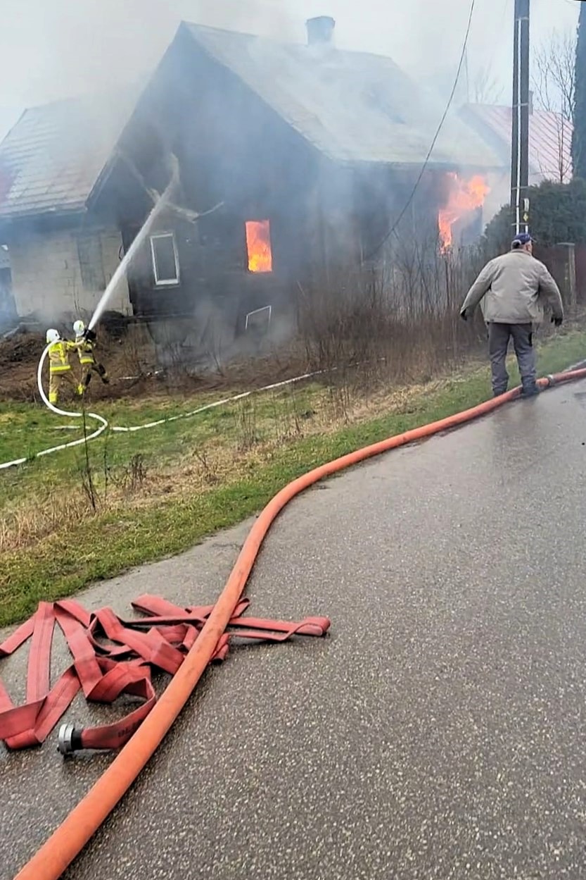 Do gaszenia pożaru drewnianego budynku zadysponowano 7 zastępów strażaków.