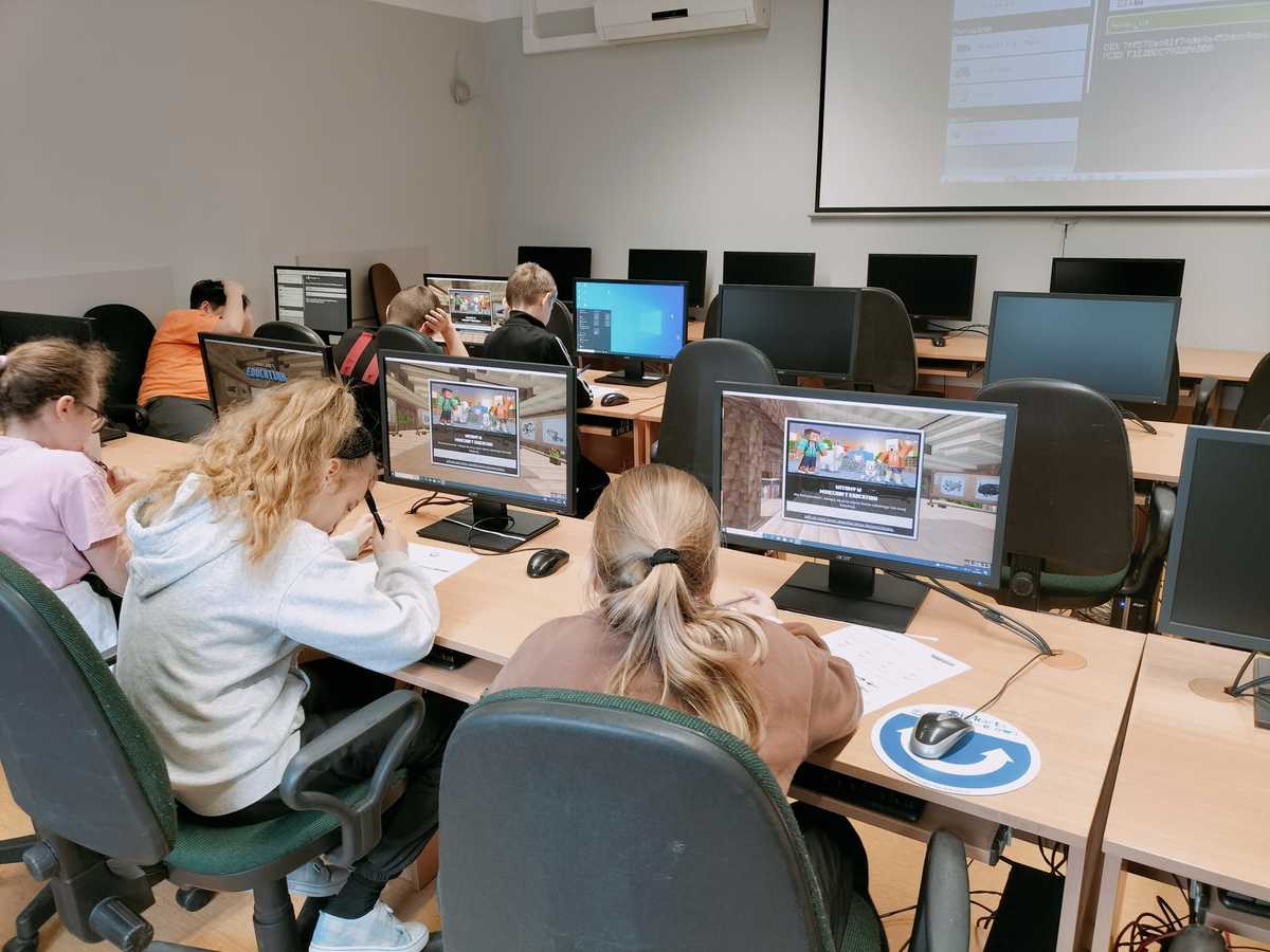 Policjanci ostrowskiej komendy przeprowadzili warsztaty z zakresu cyberbezpieczeństwa z wykorzystaniem aplikacji Minecraft Education Edition.