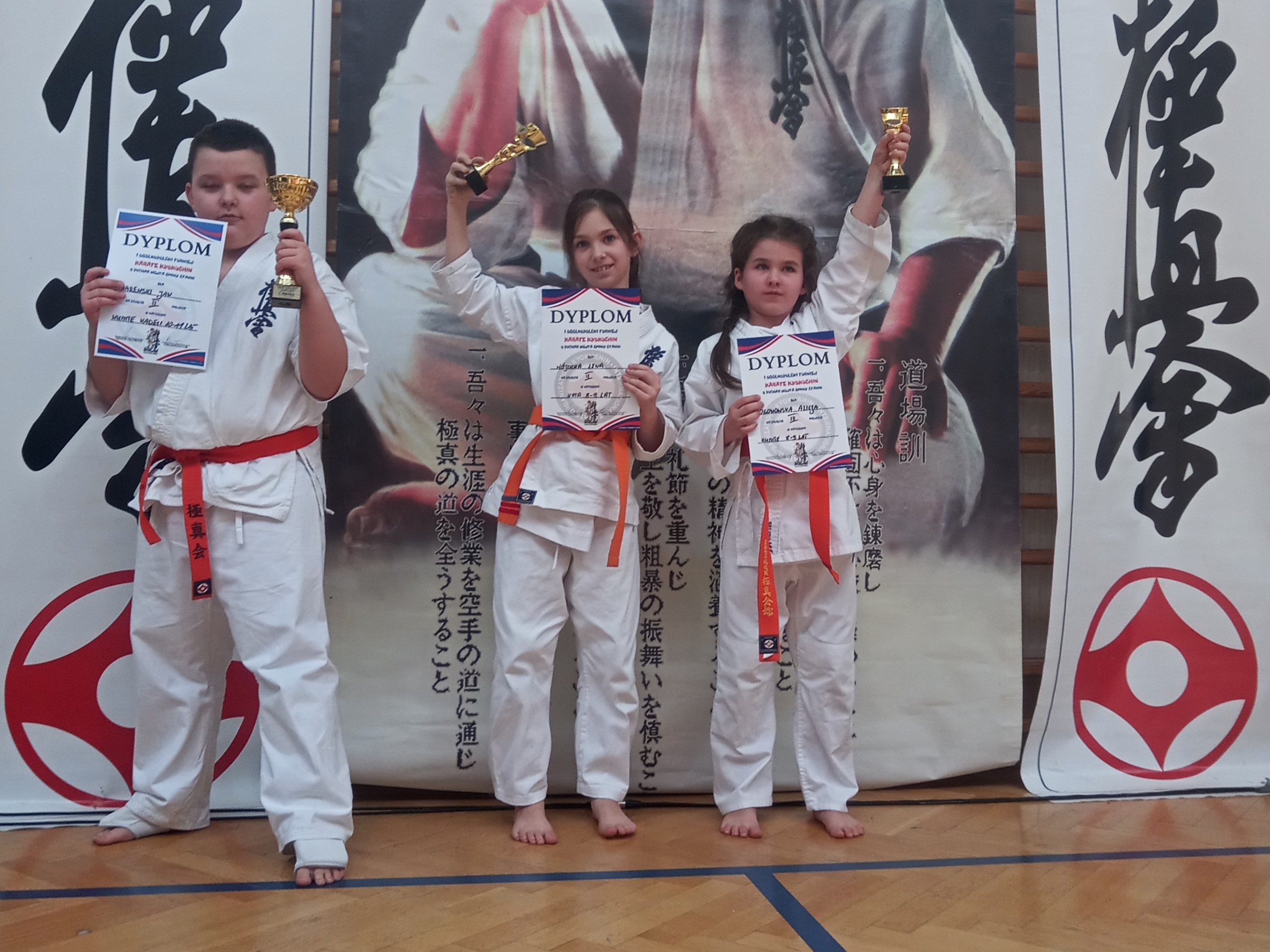 Zawodnicy z Brokowskiego Klubu Karate Kyokushinkai z pucharami.