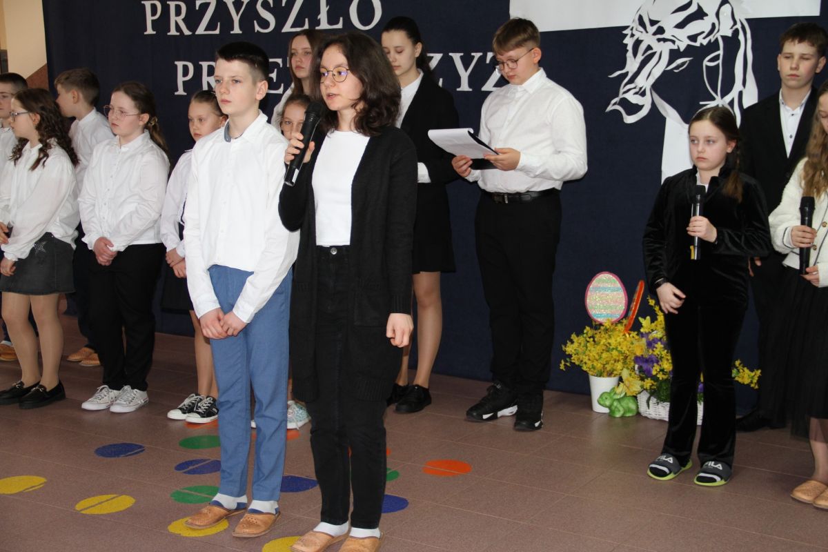 Uczniowie szkoły przygotowali montaż słowno-muzyczny jak postrzegany jest krzyż w poszczególnych epokach.
