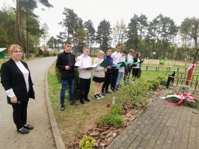Uczniowie przygotowali montaż słowno - muzyczny, złożyli hołd i zapali znicze pod Dębem Katyńskim.