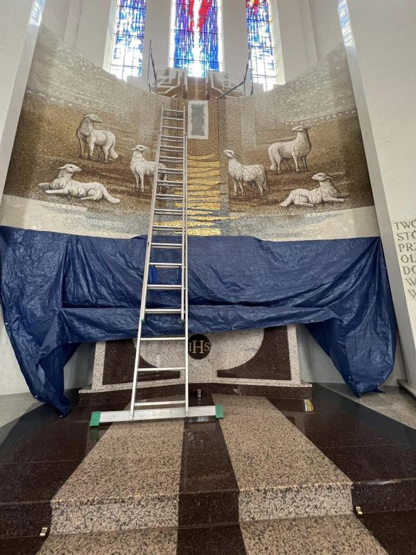 Figura Chrystusa Dobrego Pasterza została zamontowana jako zwieńczenie nastawy ołtarzowej w kościele w Ostrowi Mazowieckiej