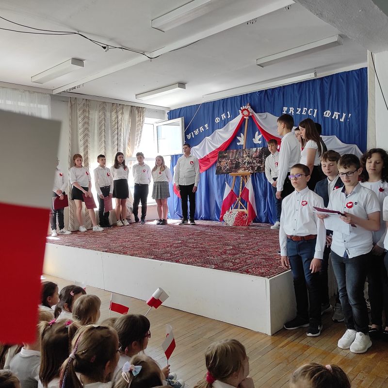 Na uroczystym apelu uczniowie przypomnieli tło historyczne tworzenia konstytucji, recytując wiersze nawiązujące do tematyki patriotycznej.