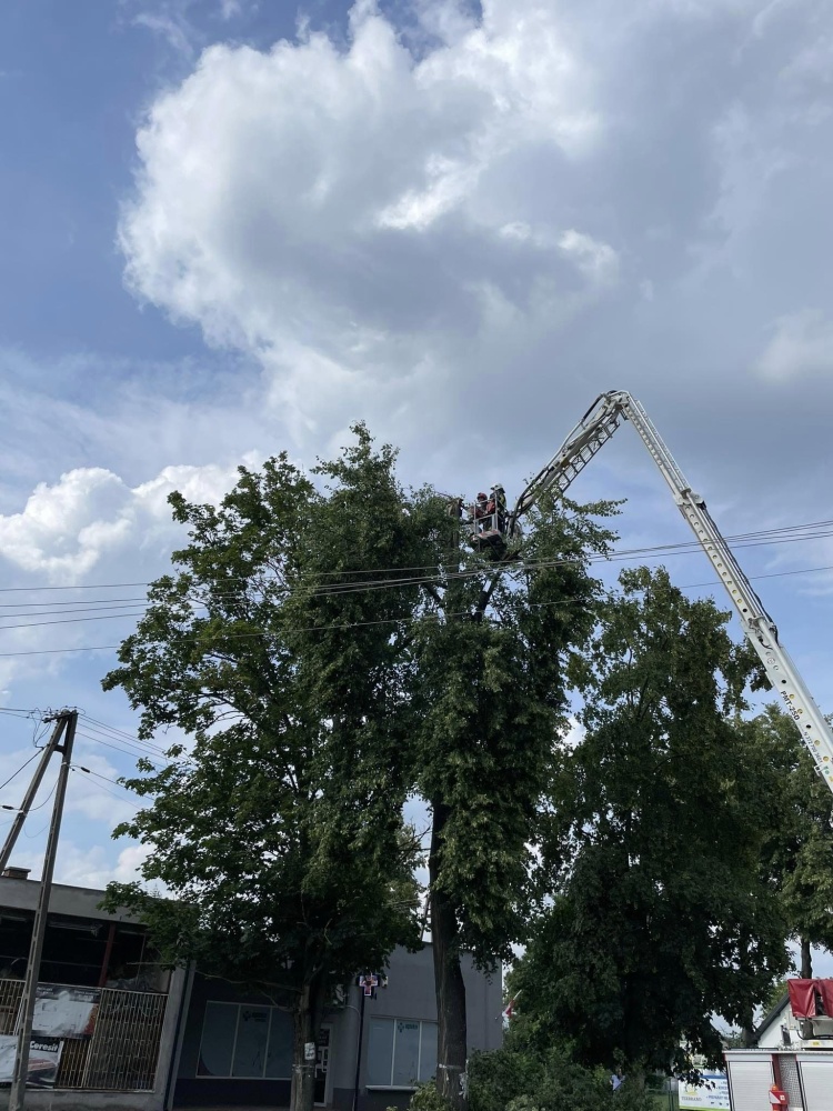 Złamany konar zagrażał pieszym i pojazdom. Ze względu na trudny dostęp do wysoko położonych gałęzi, konieczne było wezwanie podnośnika.