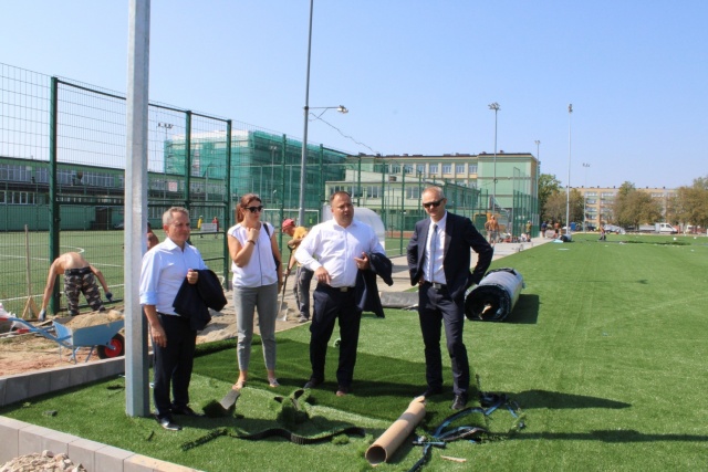 Na terenie boiska trwają zaawansowane prace, które obejmują instalację systemu nawadniania oraz układanie maty elastycznej. Obecnie kładziona jest nawierzchnia ze sztucznej trawy,
