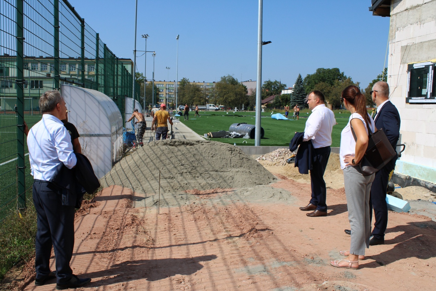 Na terenie boiska trwają zaawansowane prace, które obejmują instalację systemu nawadniania oraz układanie maty elastycznej. Obecnie kładziona jest nawierzchnia ze sztucznej trawy,