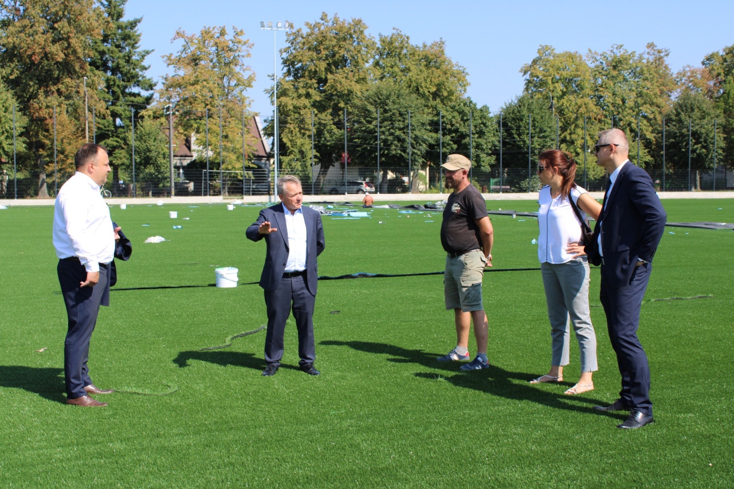 Na terenie boiska trwają zaawansowane prace, które obejmują instalację systemu nawadniania oraz układanie maty elastycznej. Obecnie kładziona jest nawierzchnia ze sztucznej trawy,