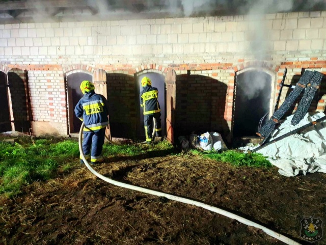 Płonący budynek gospodarczy, znajdował się w bliskiej odległości od stodołoobory.