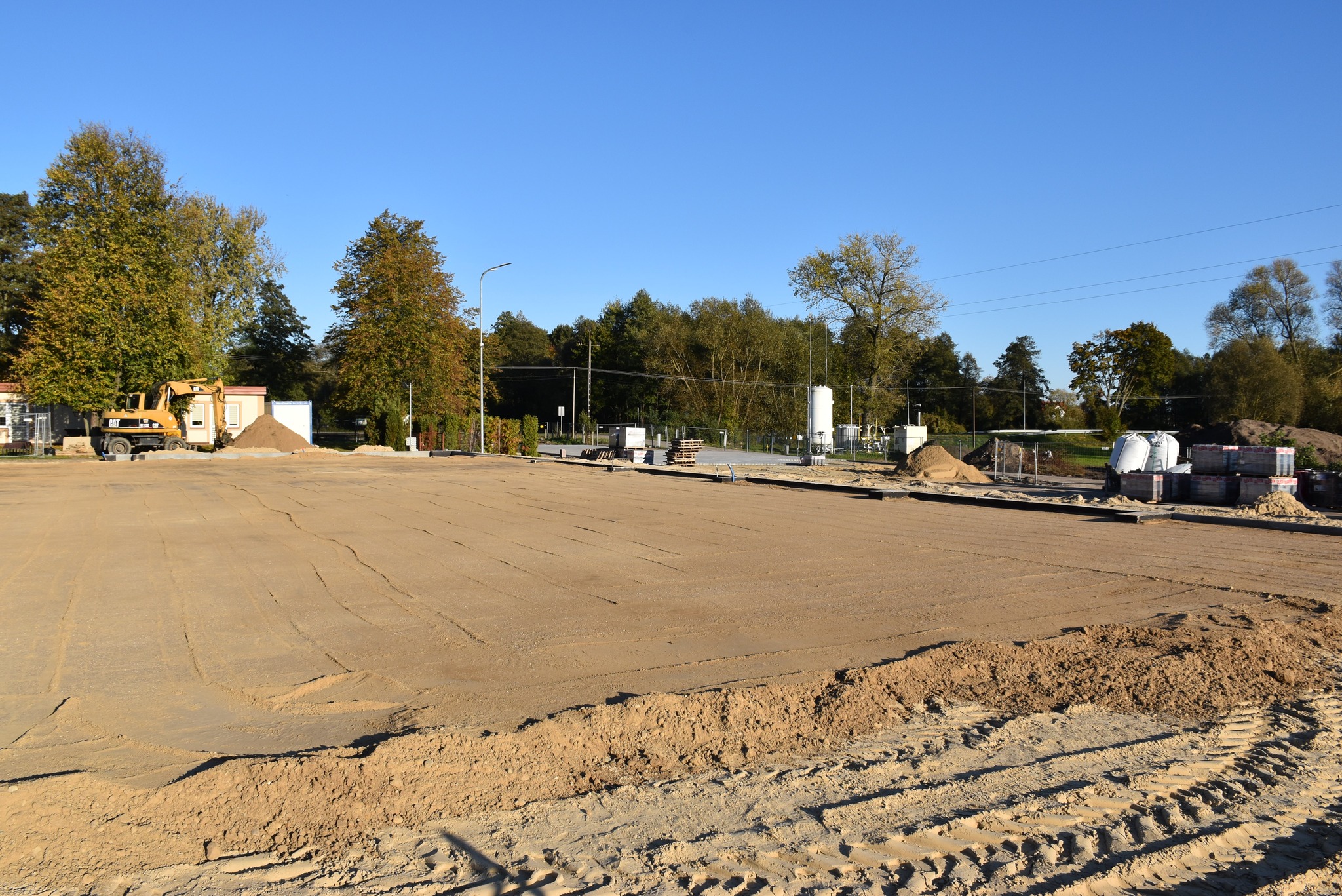 Fundamenty są już niemal gotowe, a prace nad parkingiem i drogą dojazdową postępują zgodnie z planem. Wkrótce rozpocznie się montaż drewnianego zadaszenia.