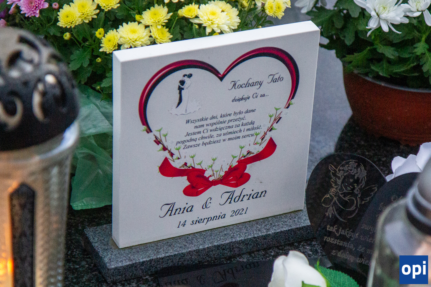 Cmentarz komunalny przy ul. Wiśniowej. Galeria przedstawia znicze, pamiątki i kwiaty, którymi upamiętniono zmarłych.