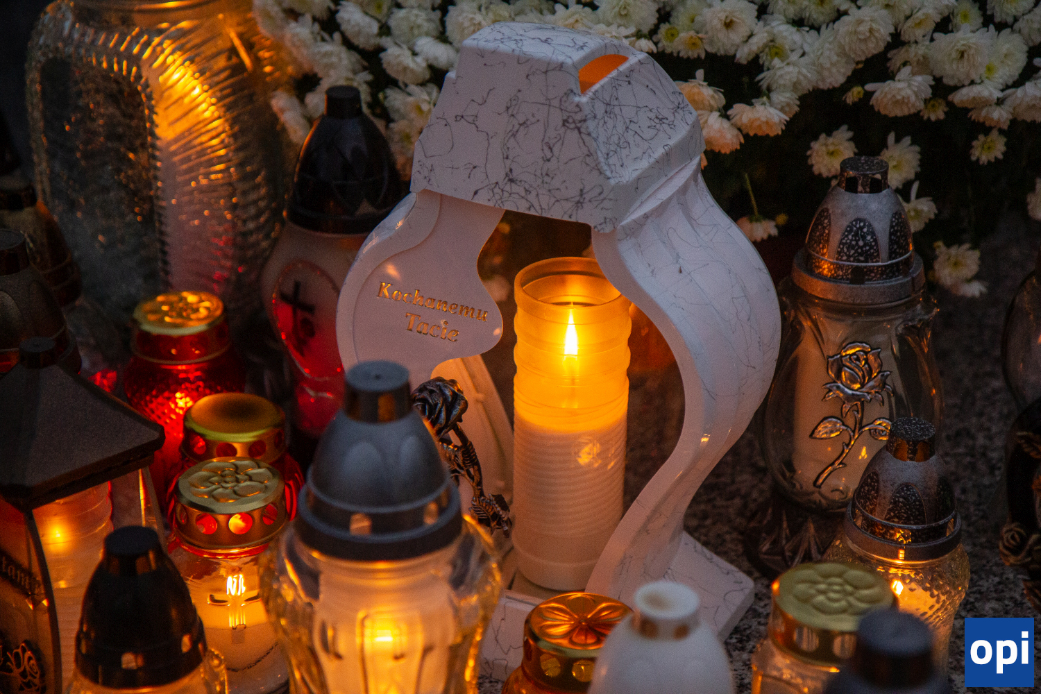 Cmentarz komunalny przy ul. Wiśniowej. Galeria przedstawia znicze, pamiątki i kwiaty, którymi upamiętniono zmarłych.