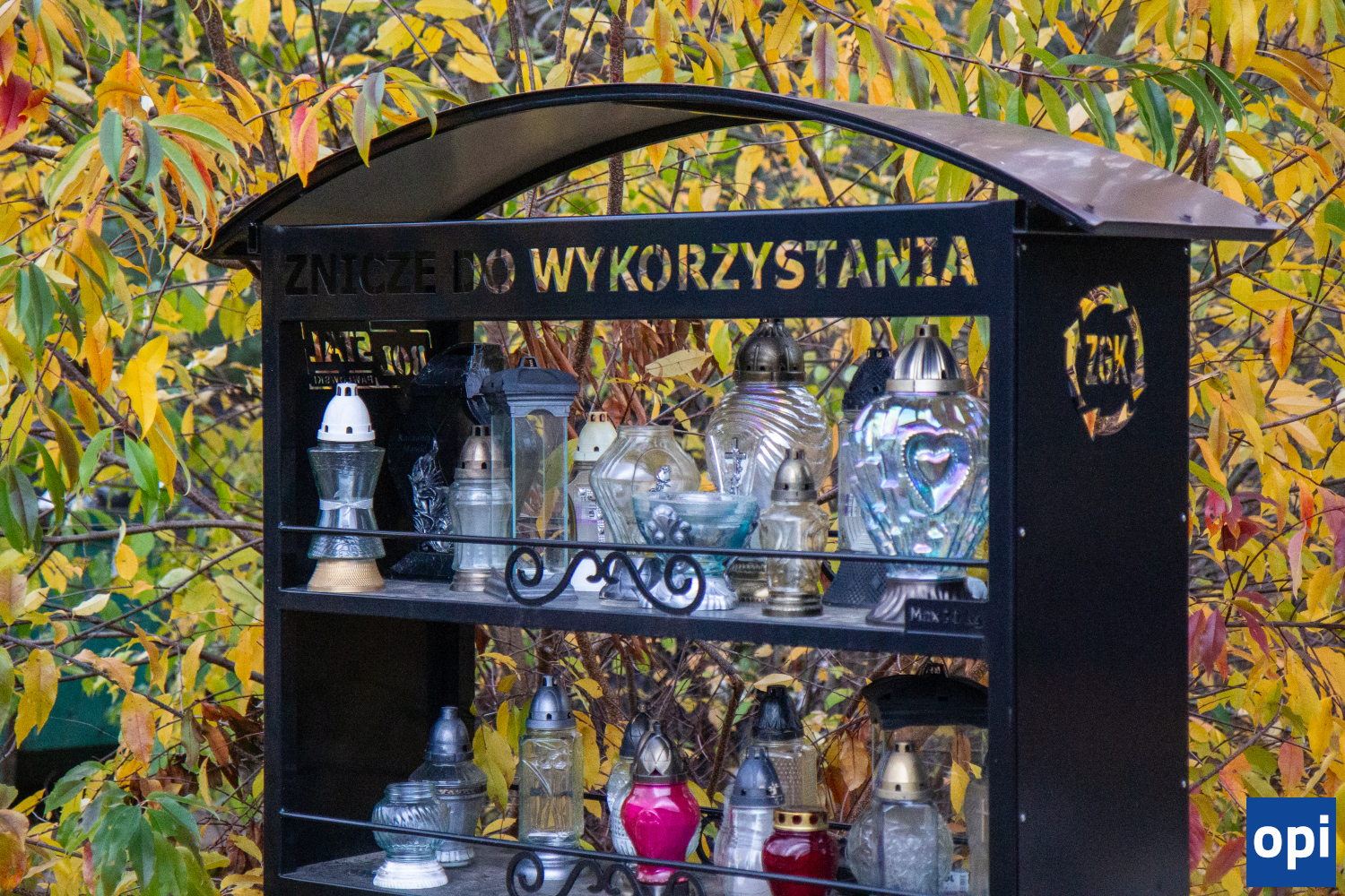 Cmentarz komunalny przy ul. Wiśniowej. Galeria przedstawia znicze, pamiątki i kwiaty, którymi upamiętniono zmarłych.