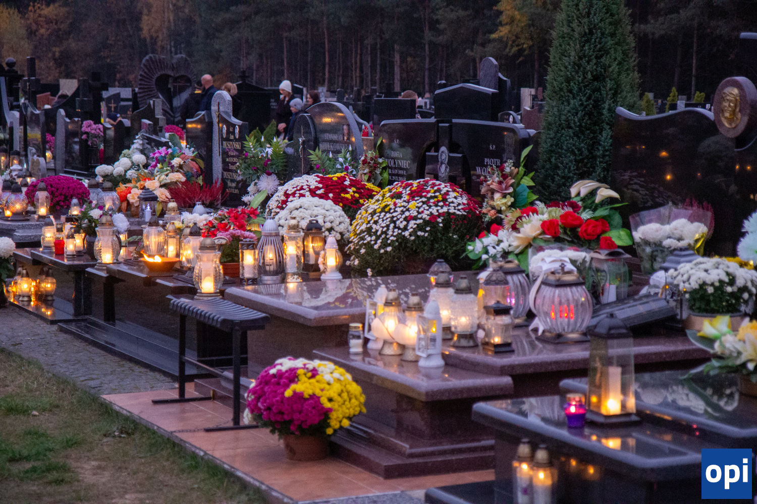 Cmentarz komunalny przy ul. Wiśniowej. Galeria przedstawia znicze, pamiątki i kwiaty, którymi upamiętniono zmarłych.