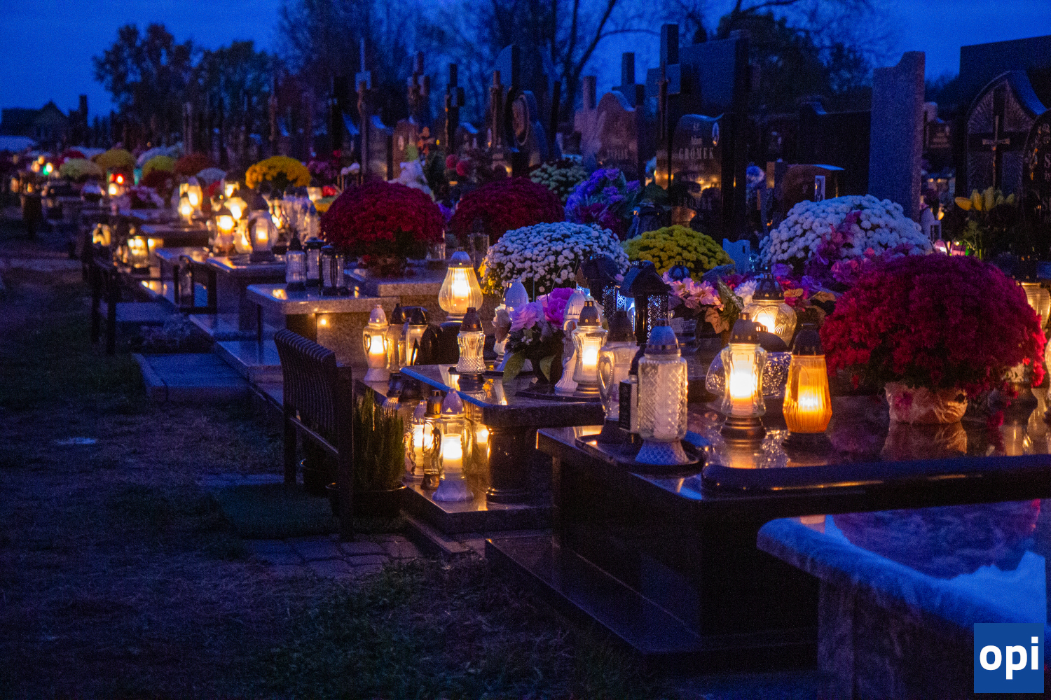 Parafialny cmentarz w Małkini Górnej po zmierzchu rozświetlił się łuną światła zniczy.