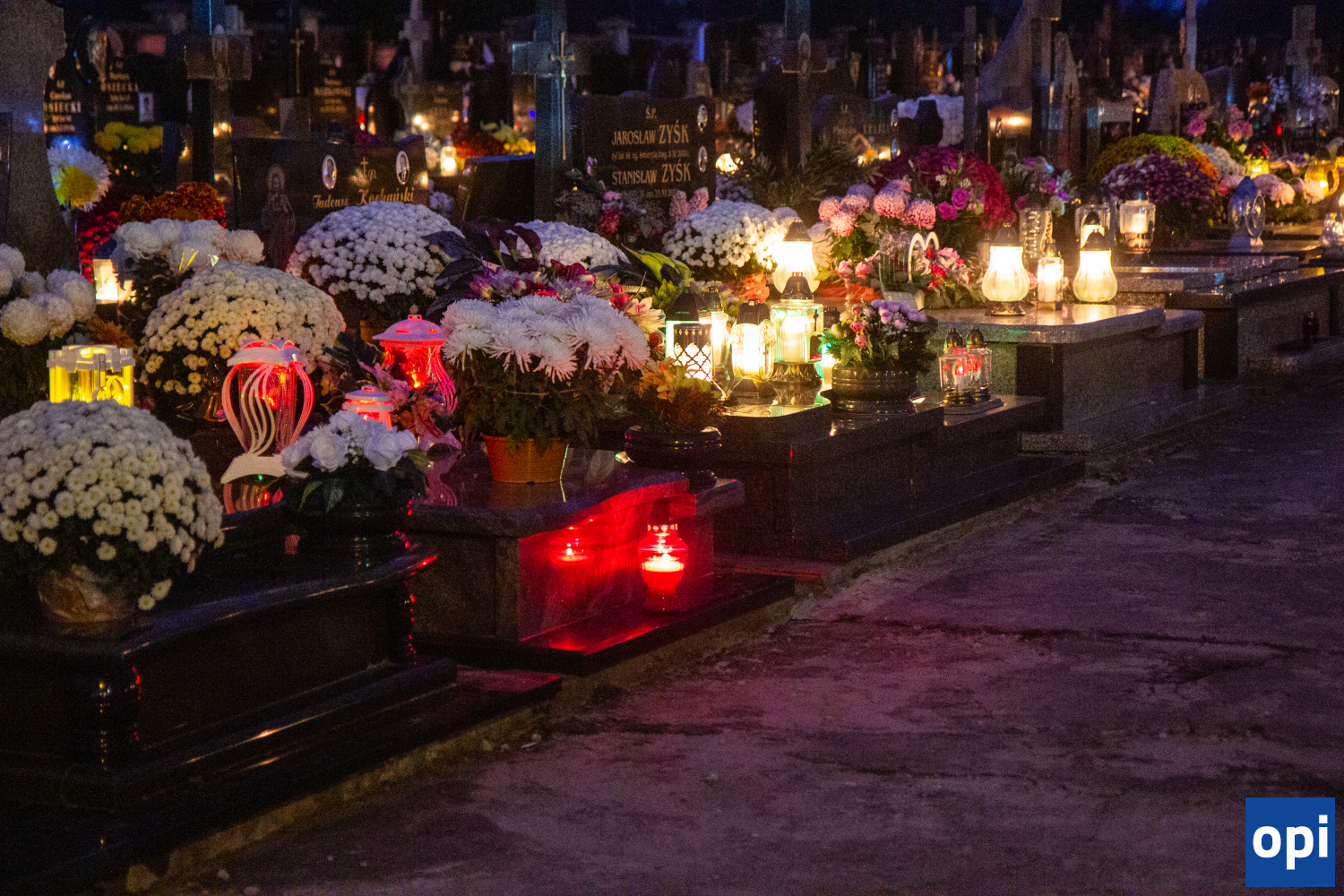 Parafialny cmentarz w Małkini Górnej po zmierzchu rozświetlił się łuną światła zniczy.