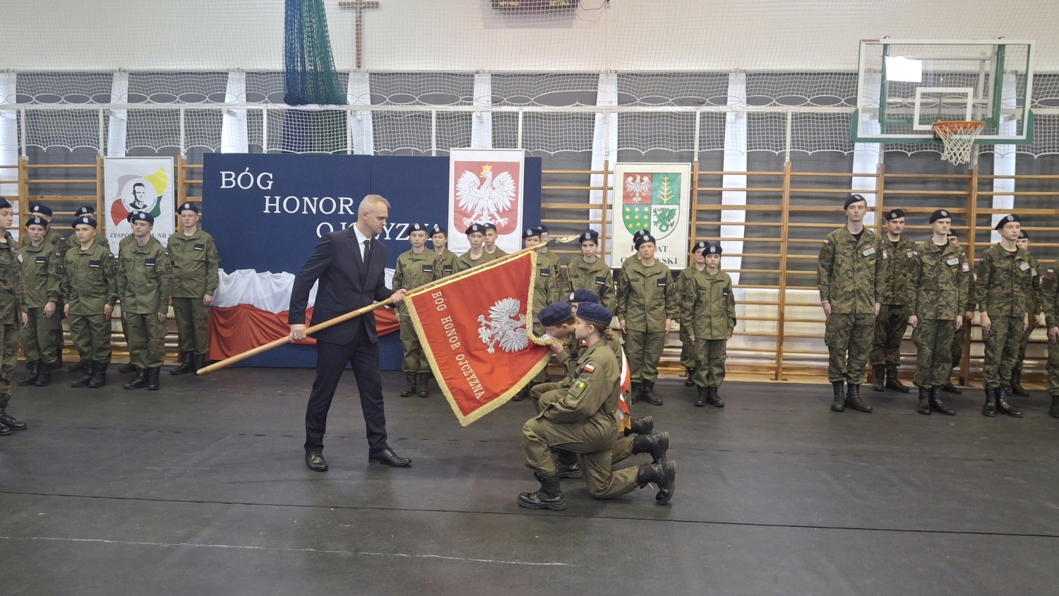 Uczniowie klasy mundurowej otrzymali nominacje na stopnie kadeckie, a nowy poczet sztandarowy został uroczyście zaprezentowany.