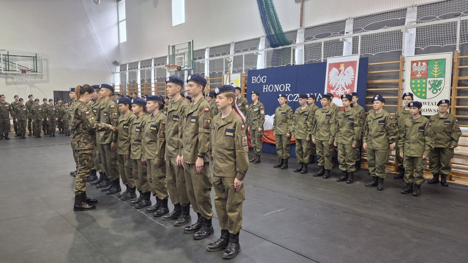 Uczniowie klasy mundurowej otrzymali nominacje na stopnie kadeckie, a nowy poczet sztandarowy został uroczyście zaprezentowany.
