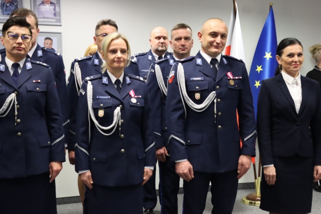 Wśród odznaczonych byli: komendant KP w Małkini Górnej asp. szt. Tomasz Zęgota oraz kom. w stanie spoczynku Justyna Biedrzycka kierującą jednostką od maja 2018 - do lutego 2024.