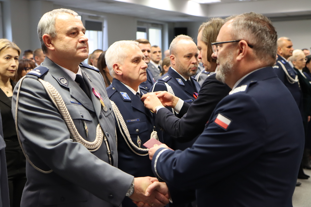 Wśród odznaczonych byli: komendant KP w Małkini Górnej asp. szt. Tomasz Zęgota oraz kom. w stanie spoczynku Justyna Biedrzycka kierującą jednostką od maja 2018 - do lutego 2024.