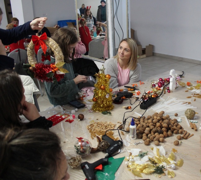 Podczas warsztatów uczestnicy mieli okazję tworzyć własnoręczne stroiki i wieńce świąteczne z naturalnych materiałów.