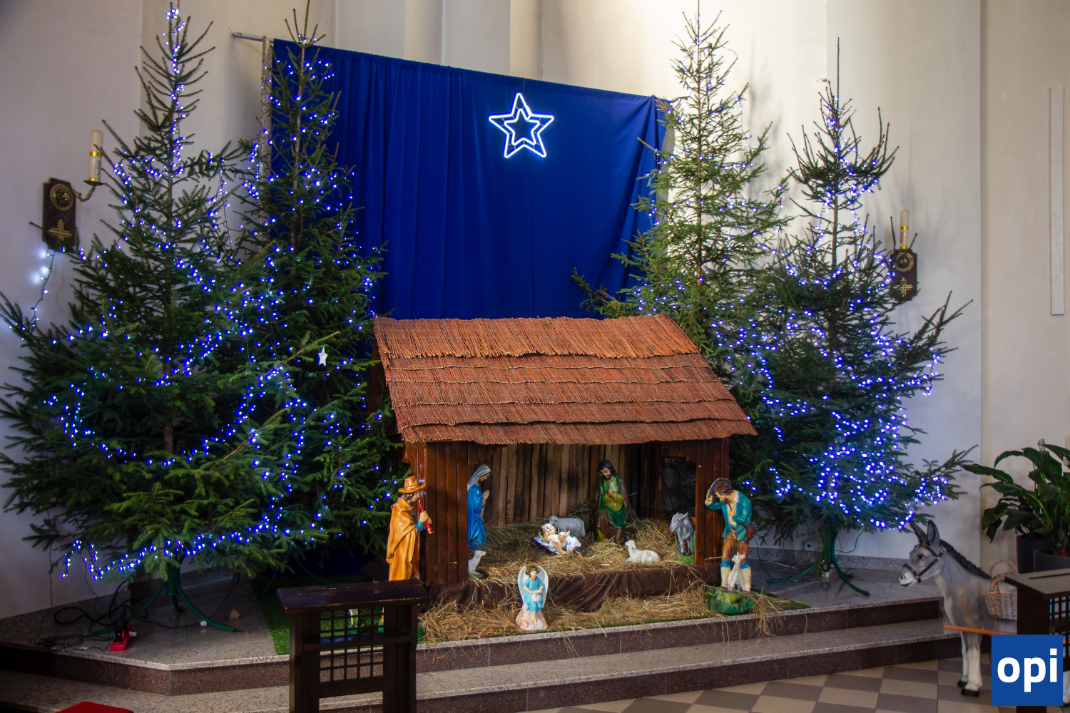 Tradycyjna szopka, przedstawiająca scenę Narodzenia Pańskiego. Podobnie jak w poprzednich latach, osioł ma słodycze dla najmłodszych parafian.