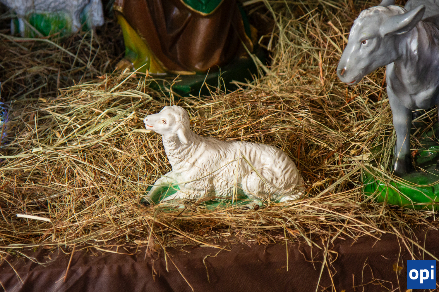Tradycyjna szopka, przedstawiająca scenę Narodzenia Pańskiego. Podobnie jak w poprzednich latach, osioł ma słodycze dla najmłodszych parafian.