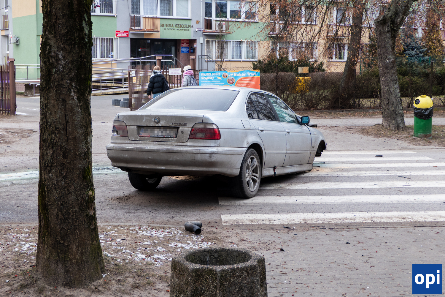 Na wysokości bursy szkolnej, samochód marki BMW zderzył się z drzewem. Droga została zablokowana.