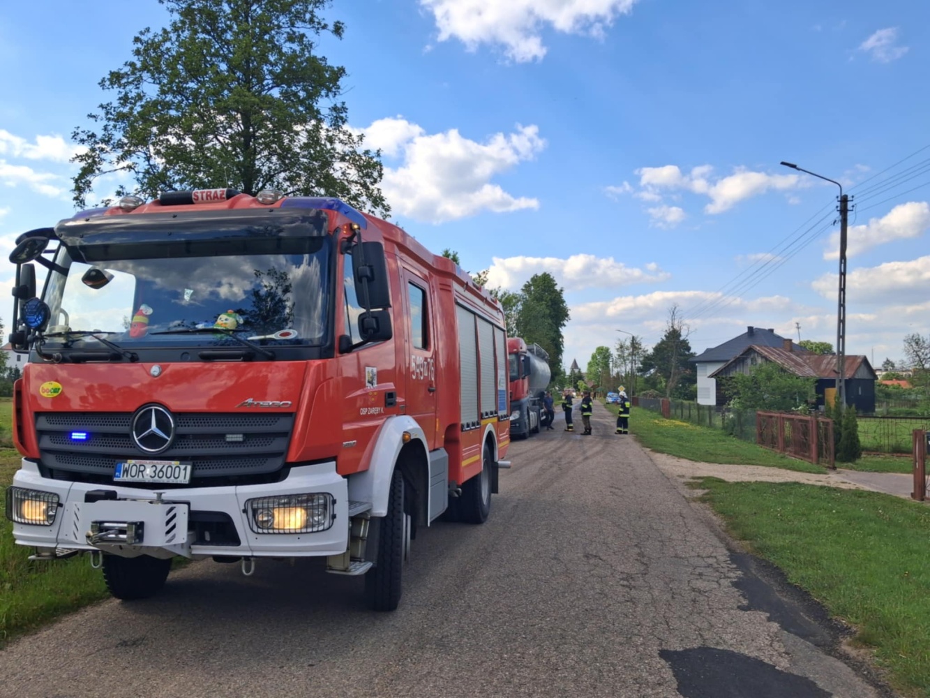 Wyciek paliwa z uszkodzonego zbiornika pojazdu ciężarowego. Paliwo zostało zneutralizowane przy pomocy specjalistycznego sorbentu.