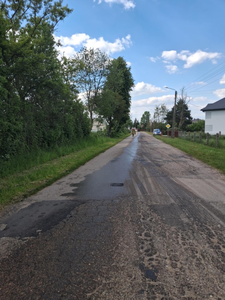 Wyciek paliwa z uszkodzonego zbiornika pojazdu ciężarowego. Strażacy zajęli się kierowaniem ruchem do czasu usunięcia zagrożenia.