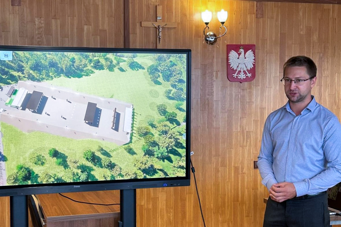 Prezentacja postępów przy budowie strzelnicy w Bogutach-Piankach na wyjazdowym posiedzeniu zarządu powiatu ostrowskiego.