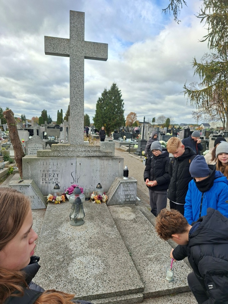 Uczniowie odwiedzili miejscowy cmentarz. Celem wizyty było zapalenie zniczy na grobach żołnierzy oraz zmarłych nauczycieli - tych, którzy przez lata służyli społeczności szkolnej i lokalnej swoją wiedzą, pasją i poświęceniem.